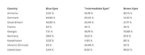 В проучване от 2019г. са разгледани данни за цвета на очите за някои страни в Европа и Централна Азия, като той е разделен на "кафяв/лешников", "междинен" и "син". Докато в страни като Армения кафявите очи са над 80 %, а сините - 3 %, в Исландия кафявите очи са 9 %, а сините - 74 %.