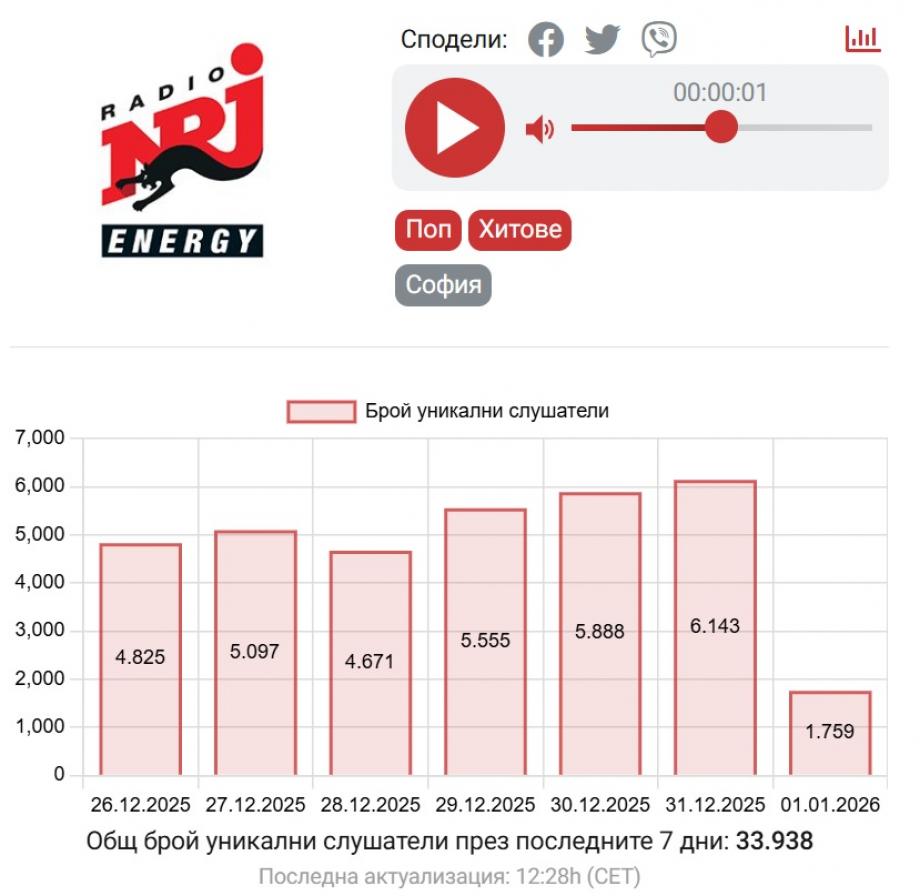 В края на годината онлайн слушането отново показа колко важно е радиото като компания и настроение. В дните около Коледа и Нова година ENERGY остава най-слушаното онлайн радио по принцип, с най-голям общ брой уникални слушатели сред всички анализирани радиостанции.