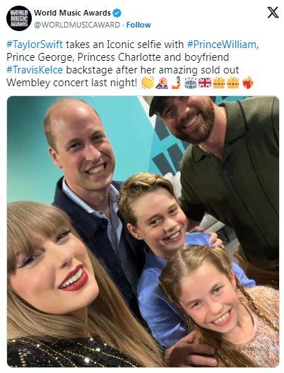 Принцът на Уелс благодари на Тейлър Суифт за "страхотния концерт", като сподели снимка на поп звездата, която си прави селфи с него и децата му Джордж и Шарлот.